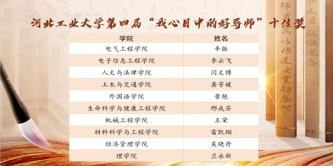 2025年9月26日,河北工业大学第四届“我心目中的好导师”十佳奖评选活动于北辰校区举行,我院副院长闫文博教授凭借深厚的学术造诣、扎实的育人担当与温暖的师者情怀,成功获评“我心目中的好导师”十佳奖,这份荣誉既是师生对他育人工作的认可,更是对他学术与教学双优实力的肯定。