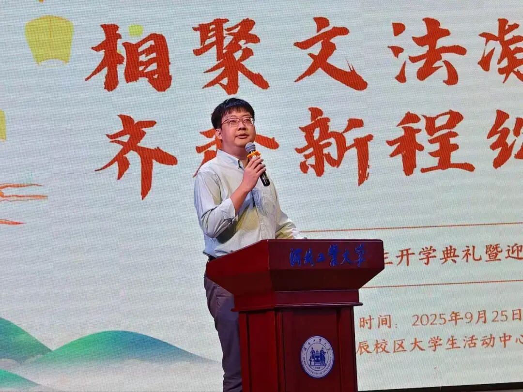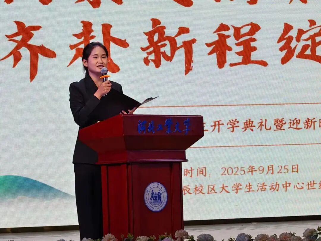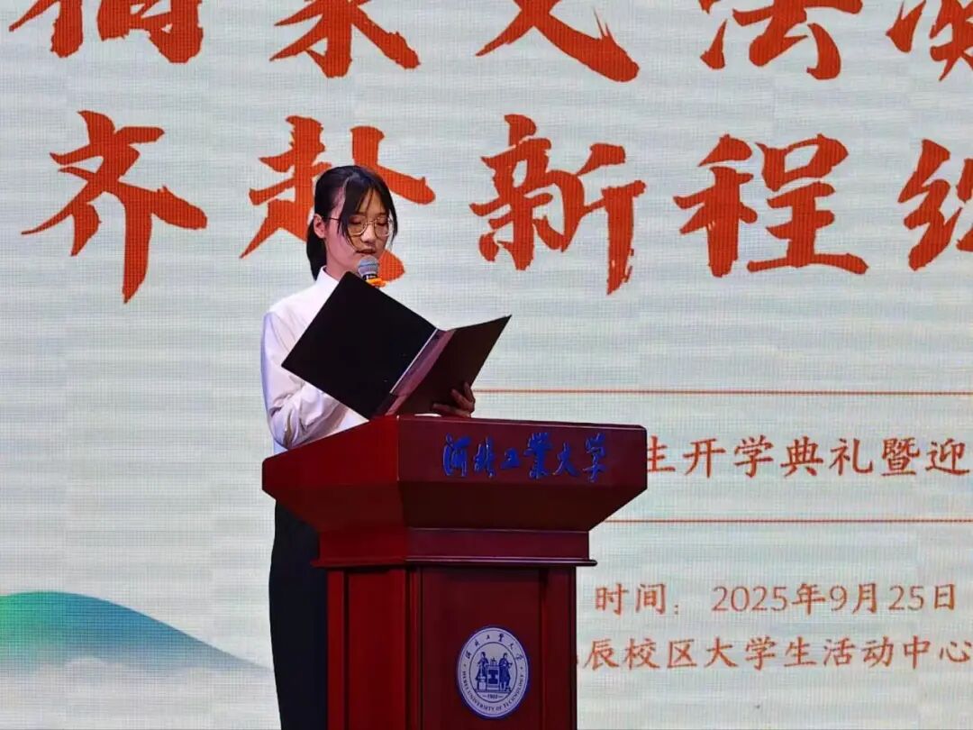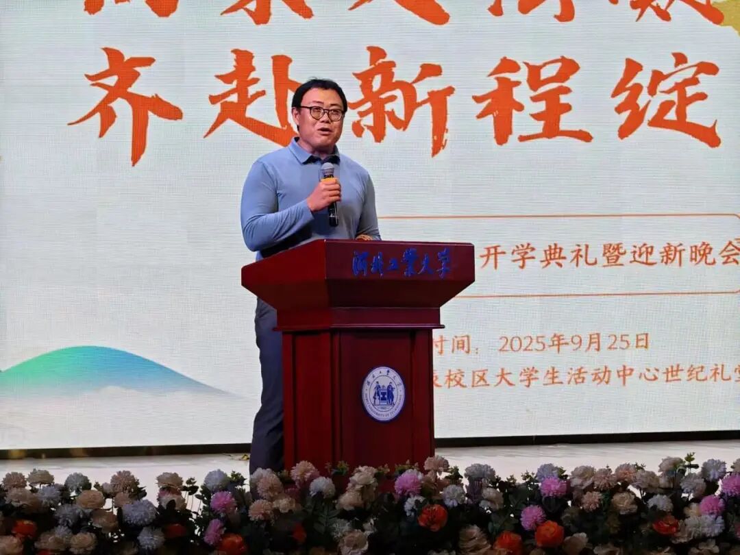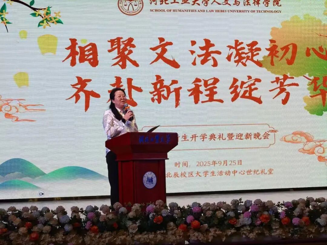 典礼伊始,人文与法律学院院长蒋冰晶作迎新致辞,向加入文法学院的新同学们表示热烈欢迎,并围绕四点期望展开寄语:一是胸怀家国天下,将个人理想融入时代脉搏,以青春力量服务社会发展;二是永葆好奇心与求知欲,既要在课堂上与老师碰撞出思想的火花,又要在社团活动中绽放自我的光彩,“纸上得来终觉浅,绝知此事要躬行”,蒋院长以此勉励同学们要在实践中探索真知、锤炼品格;三是常怀感恩之心,铭记父母的养育之恩和老师的谆谆教诲,珍惜同窗之谊,不负韶华时光;四是涵养乐观豁达的胸襟,以从容之态应对挑战,于磨砺中凝聚奋进之力。最后,蒋院长衷心祝愿文法学院的同学们能够秉承“勤慎公忠”的校训,在人文底蕴与法治精神的滋养下,成长为有温度、有筋骨、有担当的时代新人,在河北工大的热土上放飞青春梦想!
